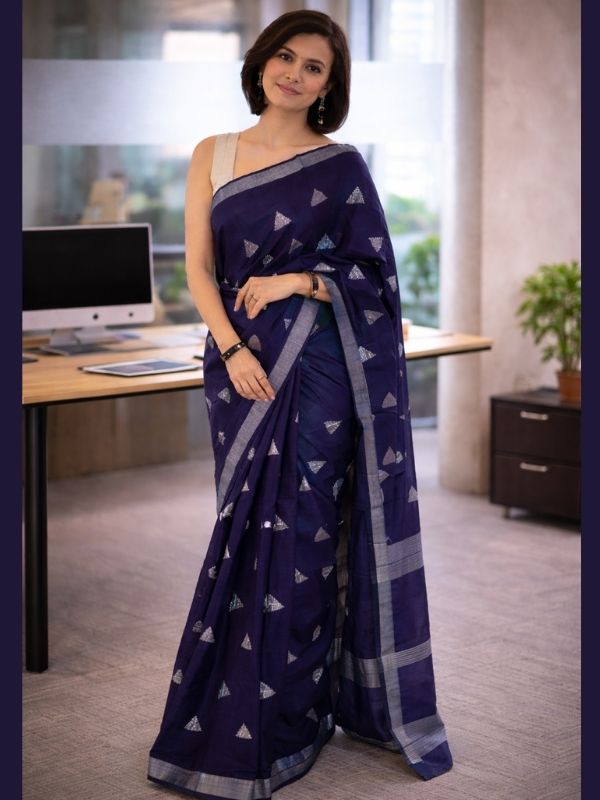 Elevate your wardrobe with Orange Hues premium blue cotton silk saree. Lightweight, elegant butta detailing with blouse piece for effortless office and occasion wear.