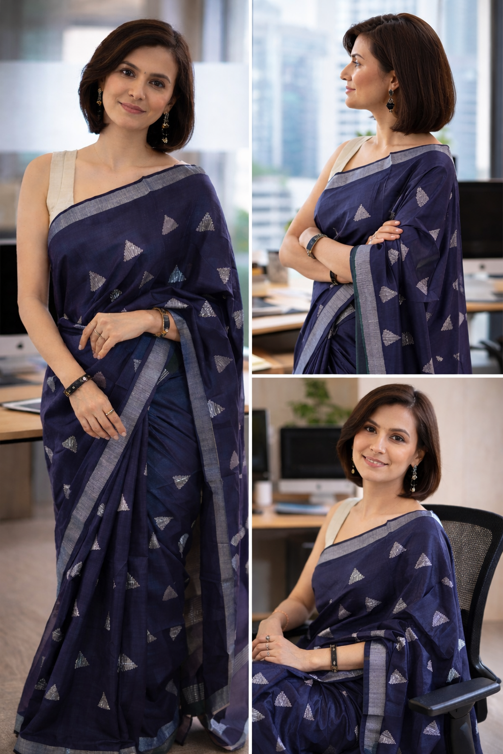Lightweight and fluid, this saree drapes effortlessly, making it ideal for long workdays, formal gatherings, festive occasions, and elegant daytime events. The serene blue tone complements all skin tones and transitions seamlessly from office wear to occasion wear.