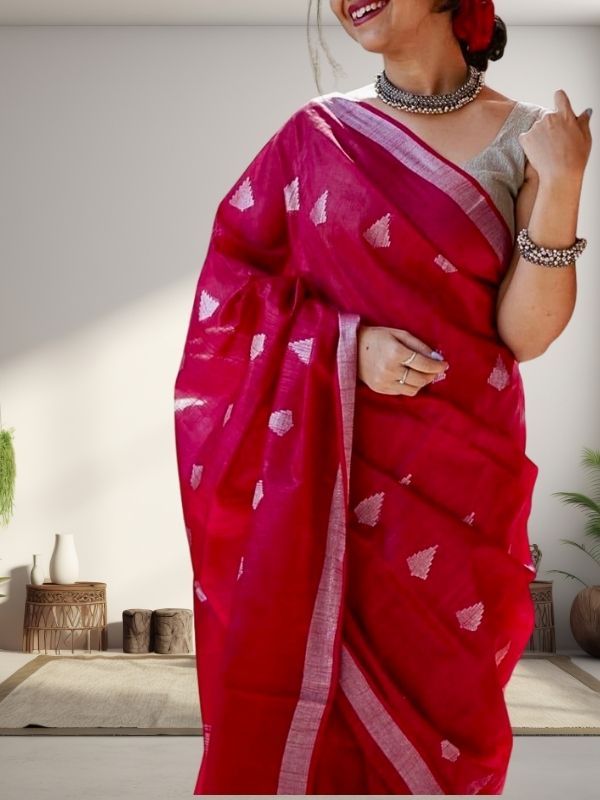 Shop magenta cotton silk saree from Orange Hues. Lightweight, breathable fabric with elegant butta motifs—perfect for office wear and graceful occasions.
