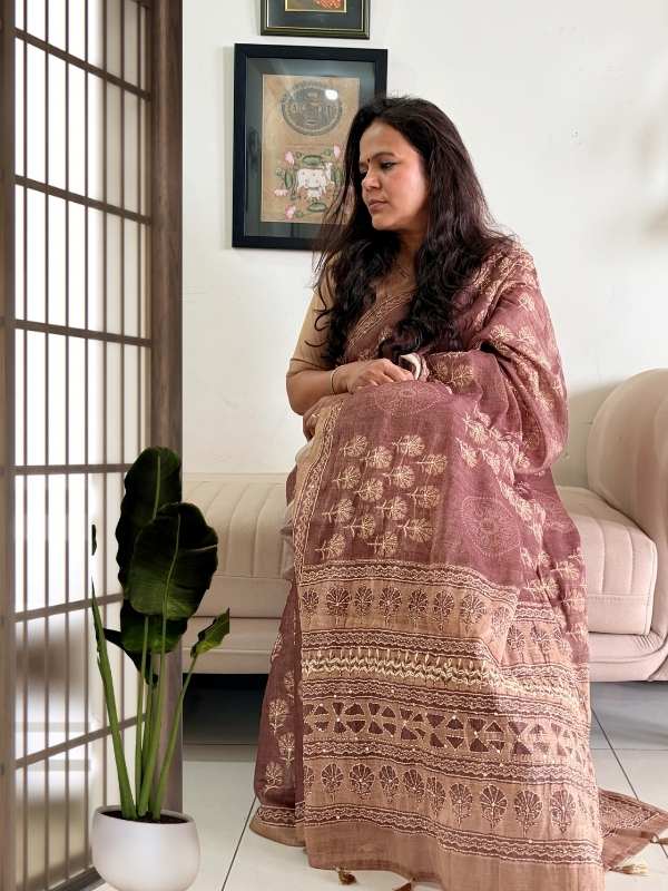 The fabric is a luxurious blend of breathable linen and shimmering tissue. The linen ensures comfort and softness against the skin, while the tissue weave adds a gentle sheen that enhances the saree’s festive appeal.